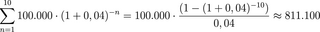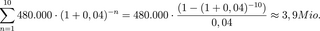 Beispiel 1: Erwartete gleichbleibende Wartungs- und Reparaturkosten über 10 (t) Jahre: 1,0 Mio. €, jährlich 100.000 €. Die jährlichen Zahlungen (C) werden auf ihren Kapitalwert mit 4 % (z) diskontiert und summiert: