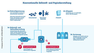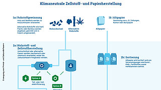 Die Herstellung von Papier geht mit einem hohen Bedarf an Wärme einher. Diese ist für die Entwässerung und Trocknung von Holzhackschnitzeln notwendig, die in einer Chemikalienlauge gekocht werden. Die Wärme wird zum größten Teil über Dampf sowie durch direkte Befeuerung (z. B. für Heißluft) erzeugt. Die dafür genutzten fossilen Brennstoffe setzen CO2 frei. Lösungsansätze für diesen Prozessschritt bestehen darin, den Strom- und Dampfbedarf durch erneuerbare Energien zu decken und auch das bei befeuerten Trocknungsprozessen verwendete Erdgas zu ersetzen. Eine Möglichkeit dafür stellt die Teilelektrifizierung der Prozesskette und das Umstellen auf Wasserstoff oder reines Biogas dar. Allerdings herrscht sowohl für die befeuerten Trocknungsprozesse als auch für einige noch wenig verbreitete Dampferzeugungstechnologien – wie der Einsatz von Geothermie – noch Forschungsbedarf.